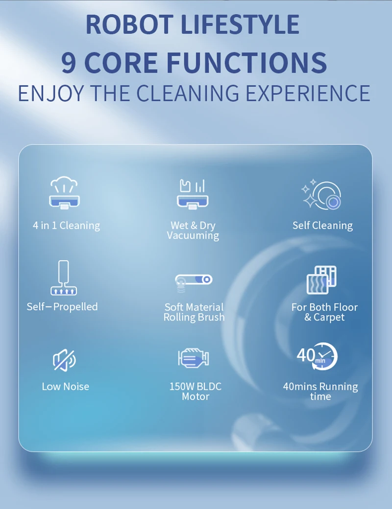 4 in 1 Cleaning / Wet & Dry Vacuuming / Self Cleaning / Self-Propelled / Soft Material Rolling Brush / For Both Floor& Carpet / Low Noise / 150W BLDC Motor / 40mins Running time