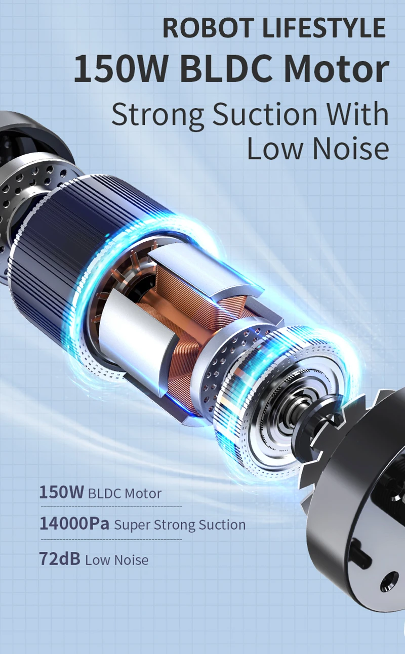 150W BLDC Motor / 14000Pa super strong suction / 72dB Low Noise